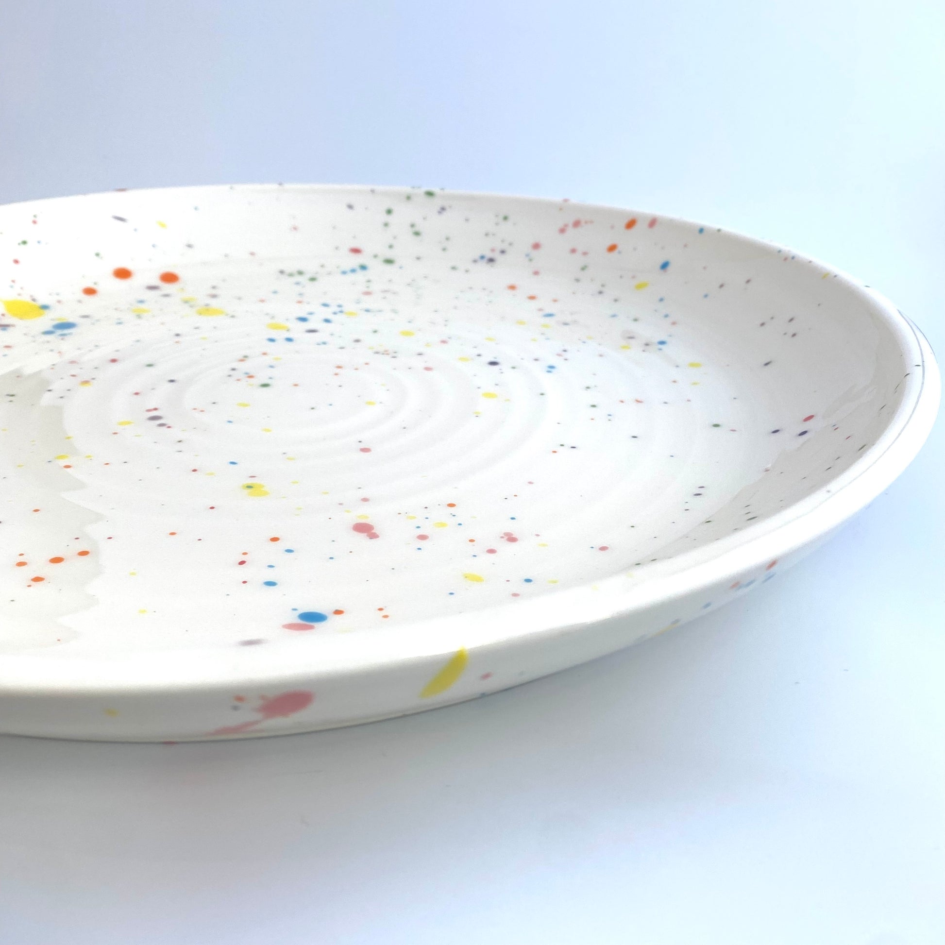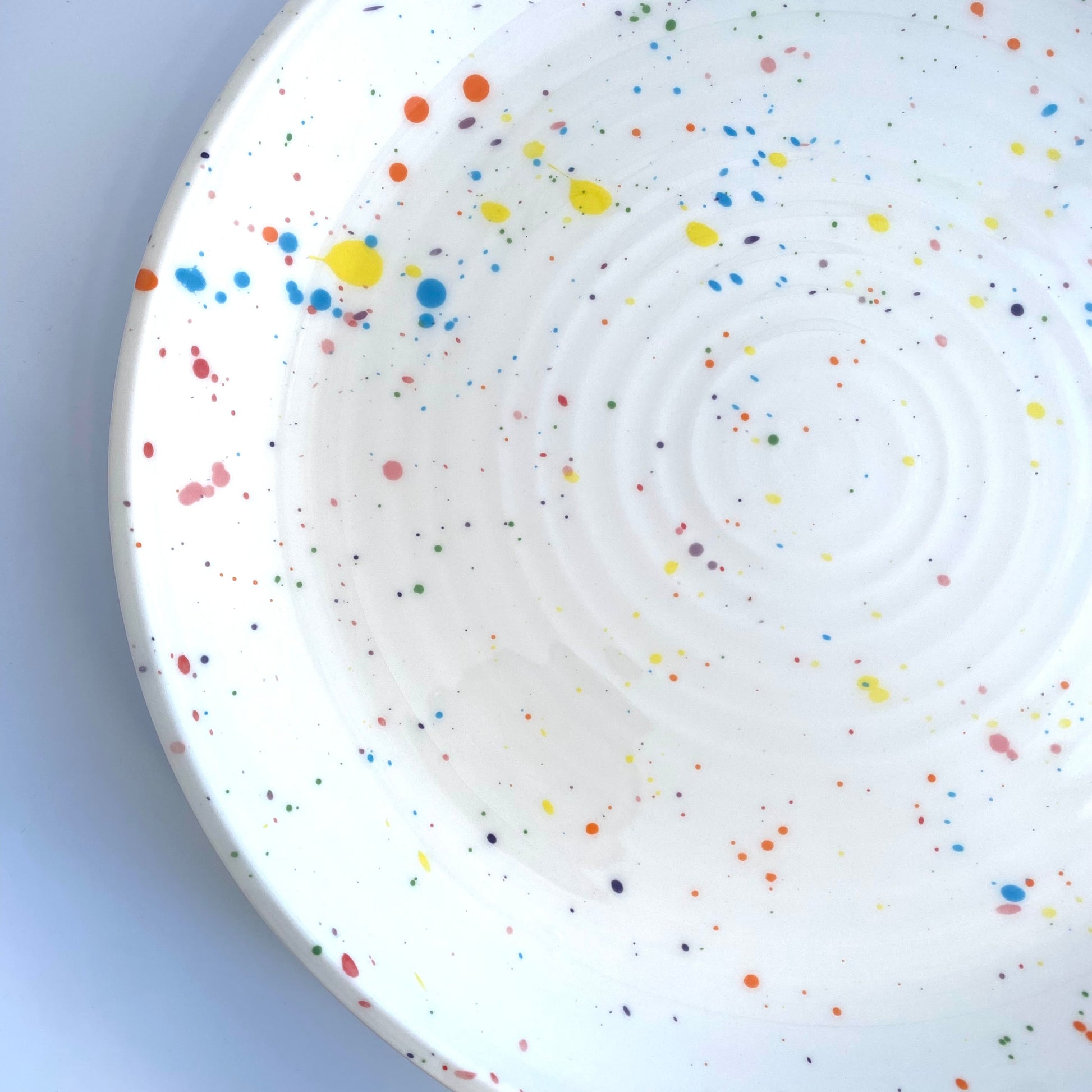Wheel thrown bowl in white earthenware. Decorated in rainbow sprinkles and finished in clear gloss. Suitable as a large serving bowl or fruit bowl.