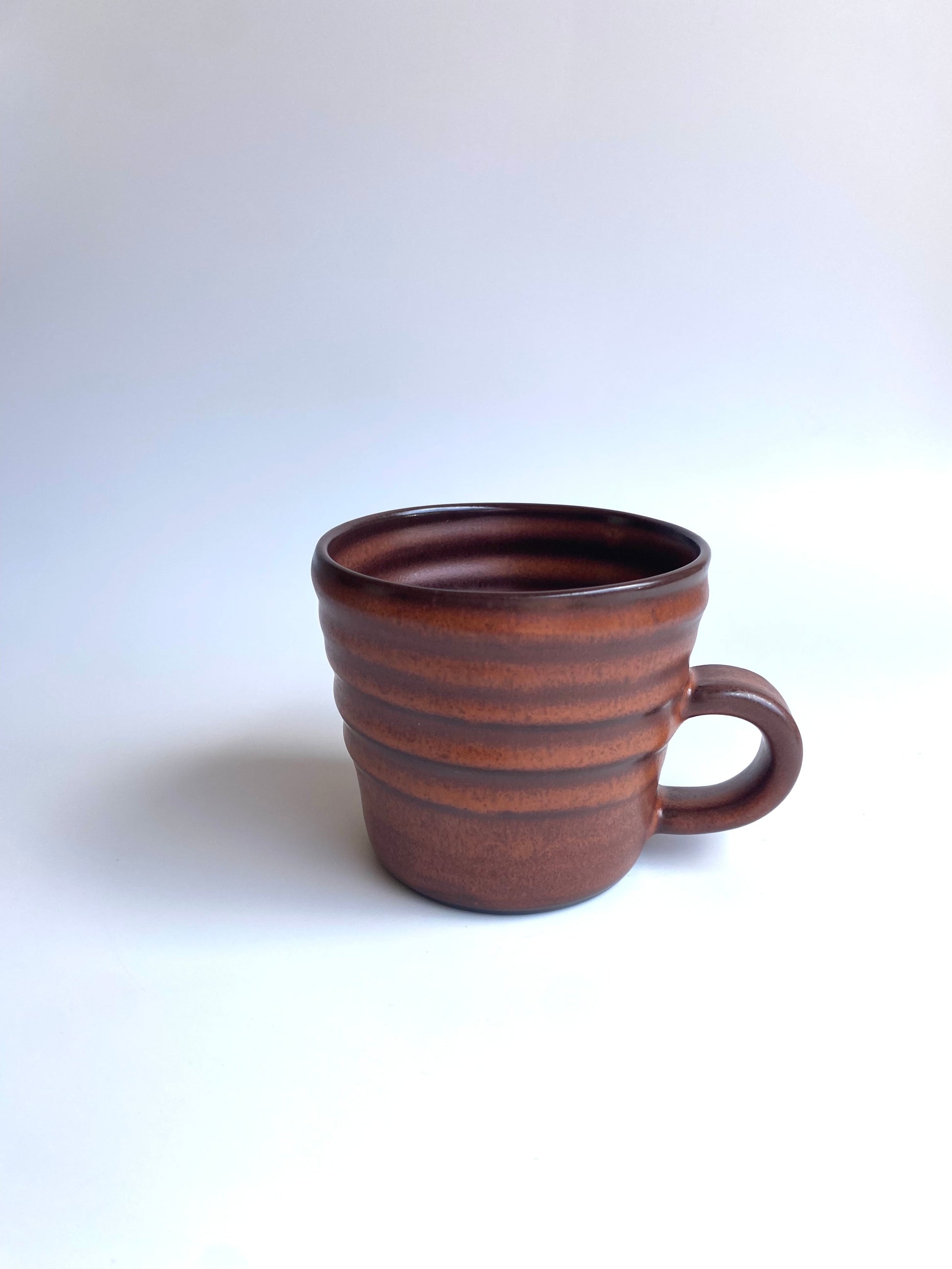 Wheel thrown mug in black earthenware. Glazed in bronze. One is slightly flared and one more rounded in shape, see images.