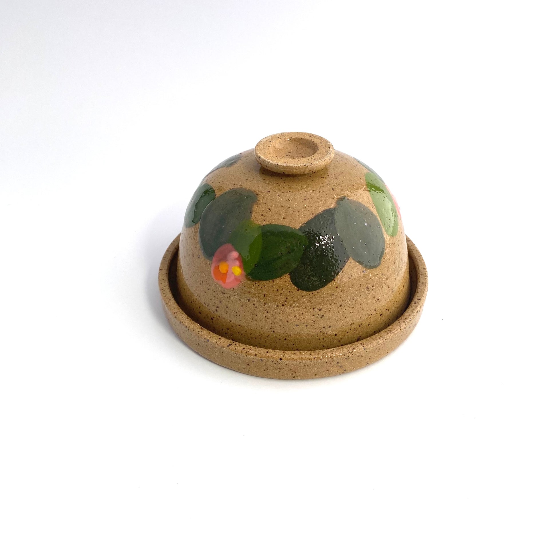 Wheel thrown butter dish and plate in speckled stoneware. Hand painted in garden variety design and glazed in clear gloss.