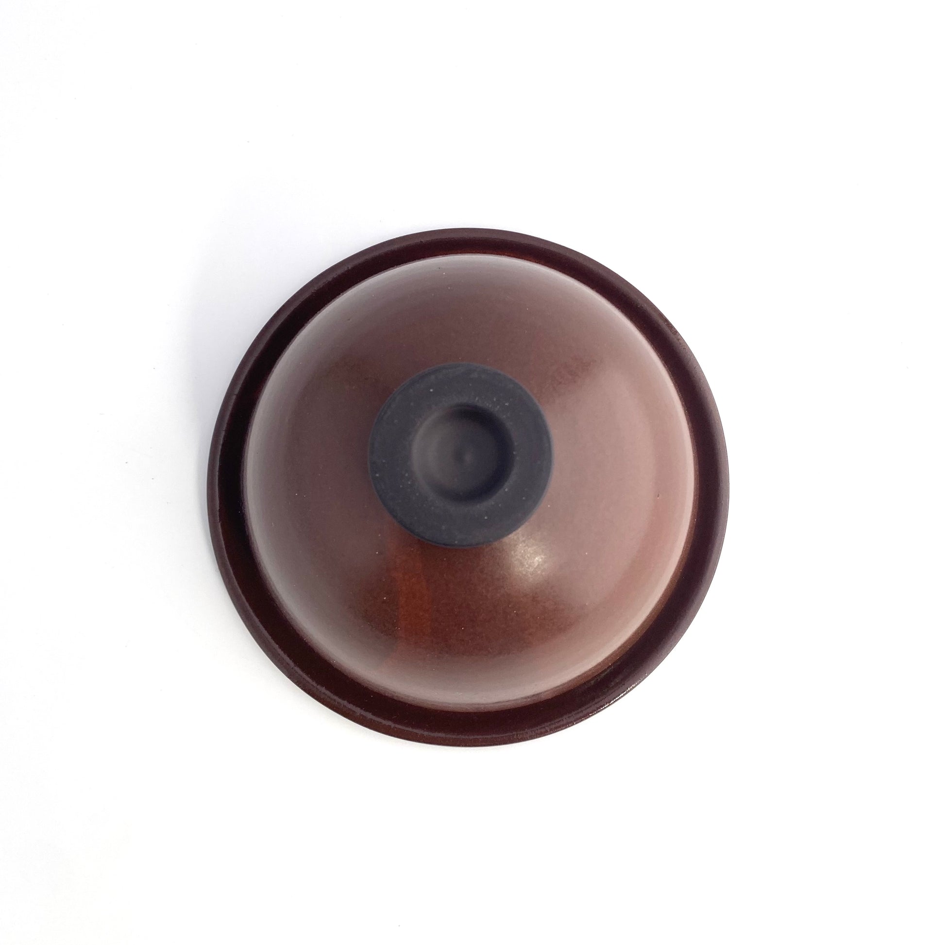 Wheel thrown butter dish and plate in black earthenware, glazed in bronze. Plate designed to fit a generous slice of butter from a standard 500g block.