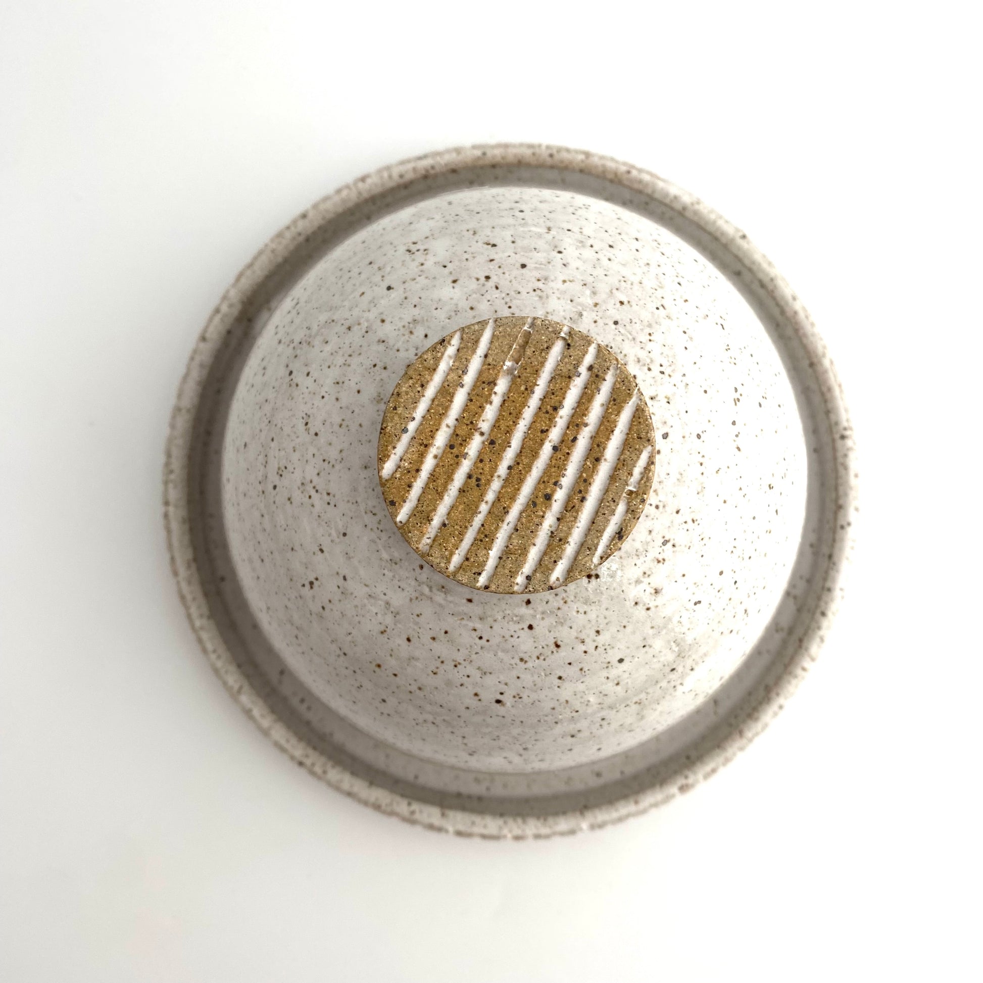 Wheel thrown butter dish and plate in speckled stoneware, glazed in white.