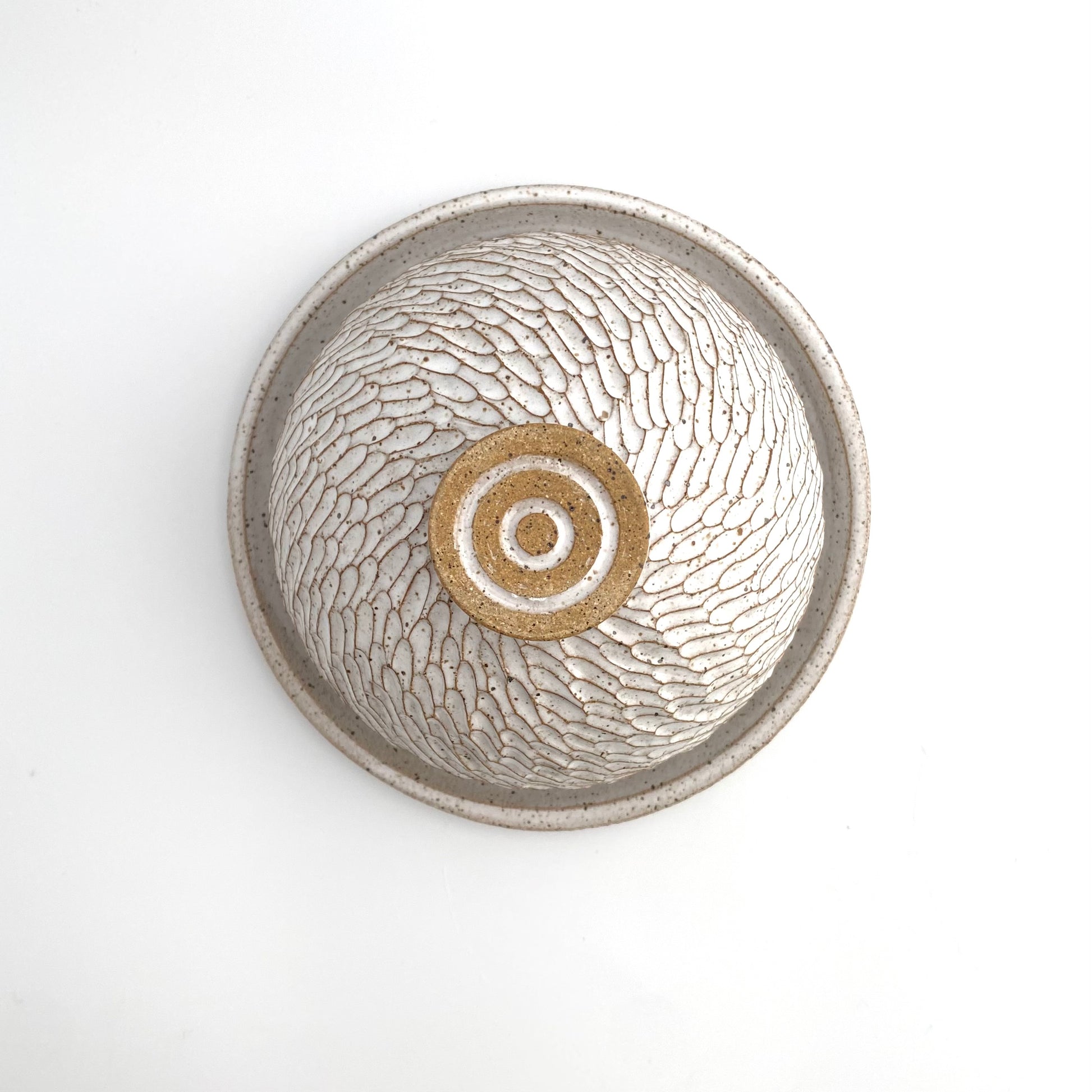 Wheel thrown butter dish and plate in speckled stoneware. Hand carved in rainstorm pattern, finished in a glossy white glaze. Plate will fit a slice of butter from a 500g block.