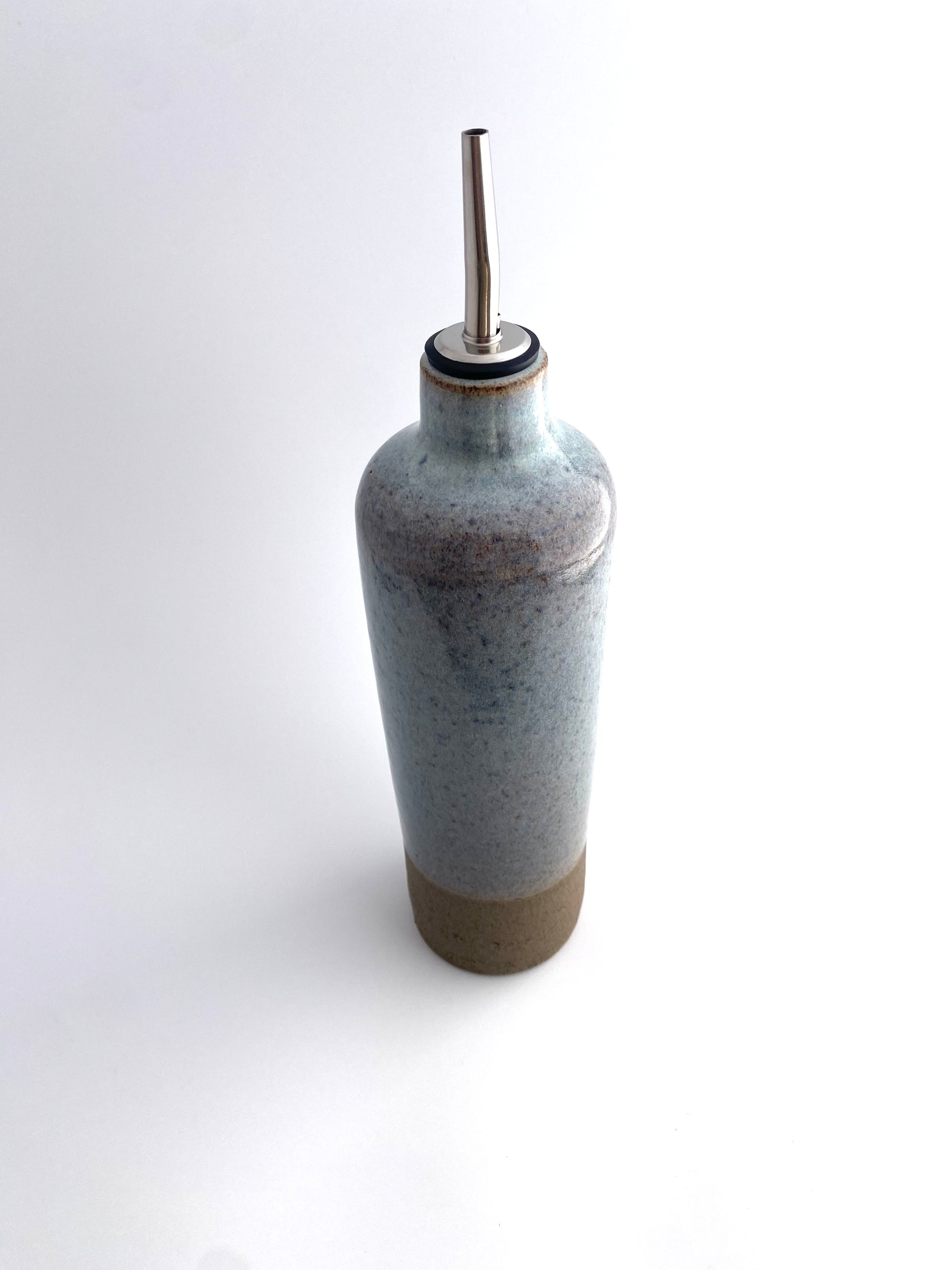 Wheel thrown olive oil vessel in slate earthenware, glazed in mist.