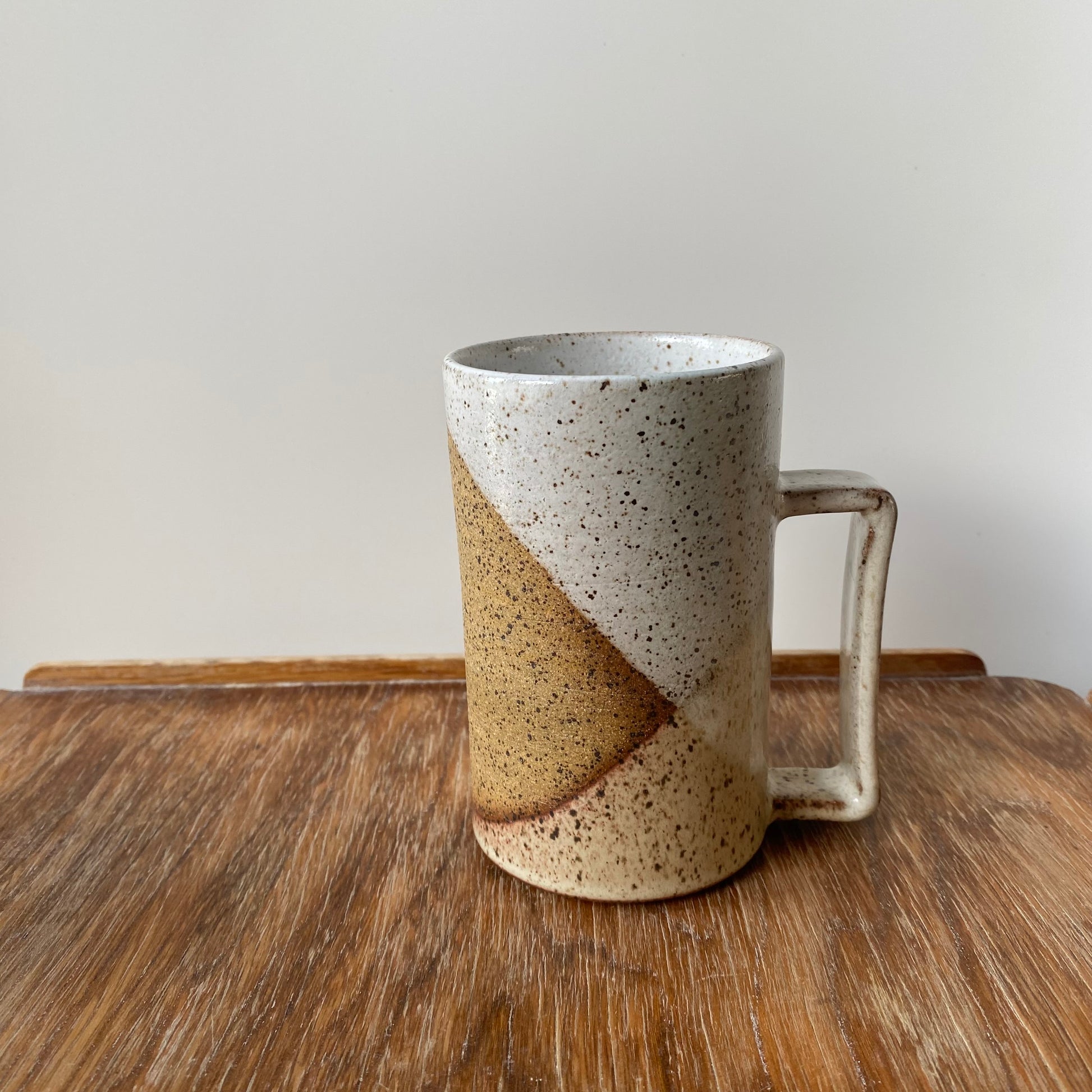 Wheel thrown large oblo mug in speckled stoneware. Decorated in cut out pattern.