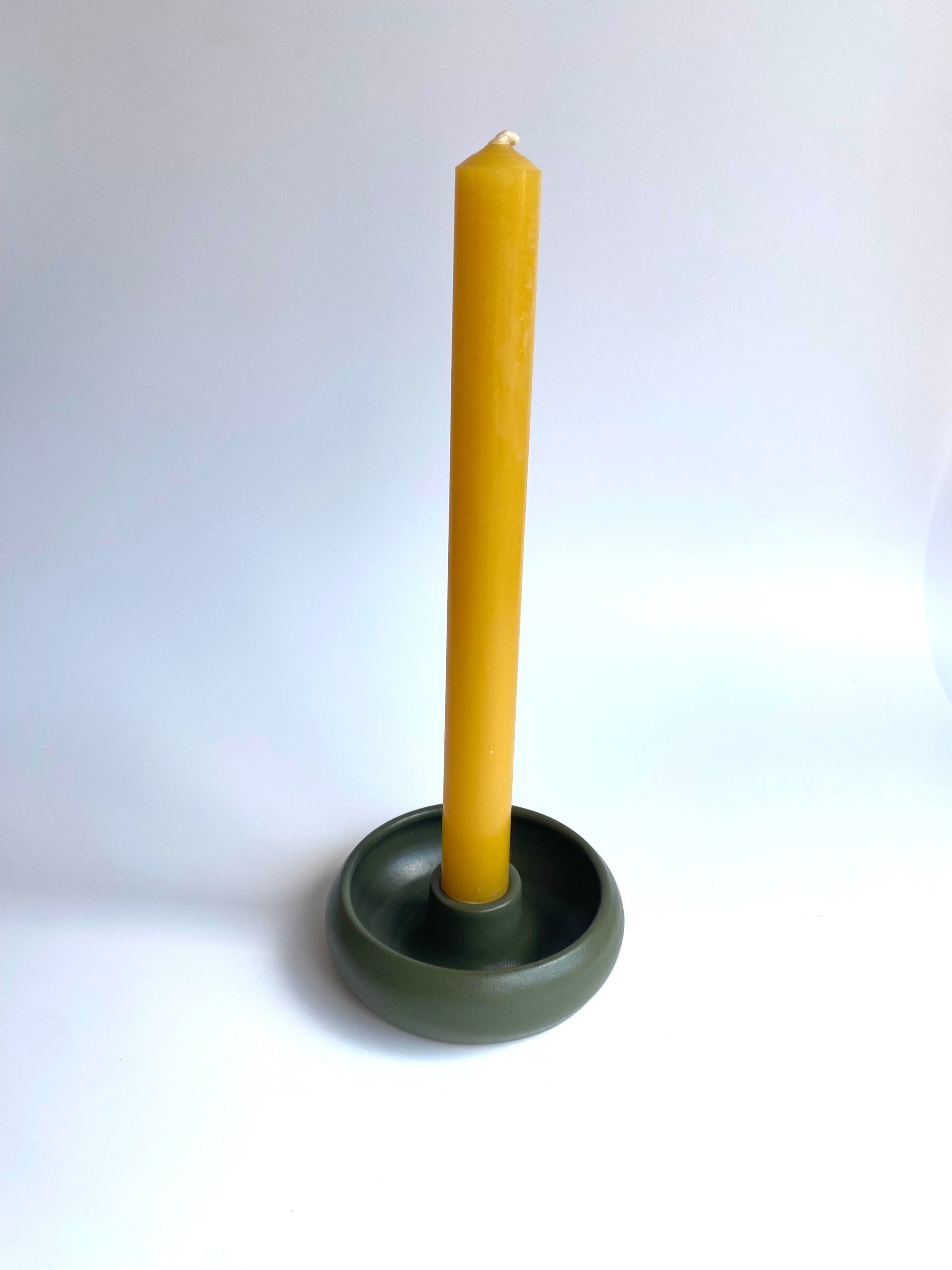 Wheel thrown candle holder in sand earthenware, glazed in forest green. Candle included (beeswax candle from National Candles in Wellington).