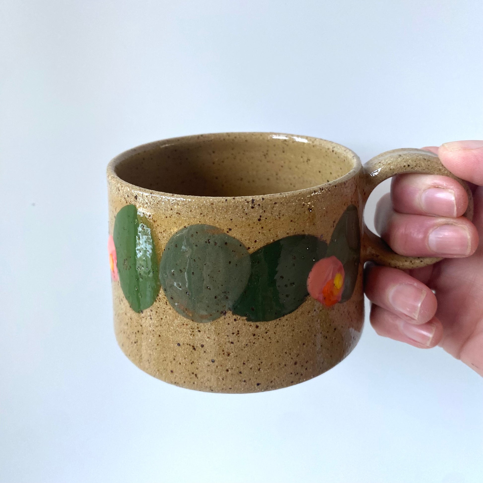 Wheel thrown mug in speckled stoneware. Painted in garden theme with clear glaze finish.