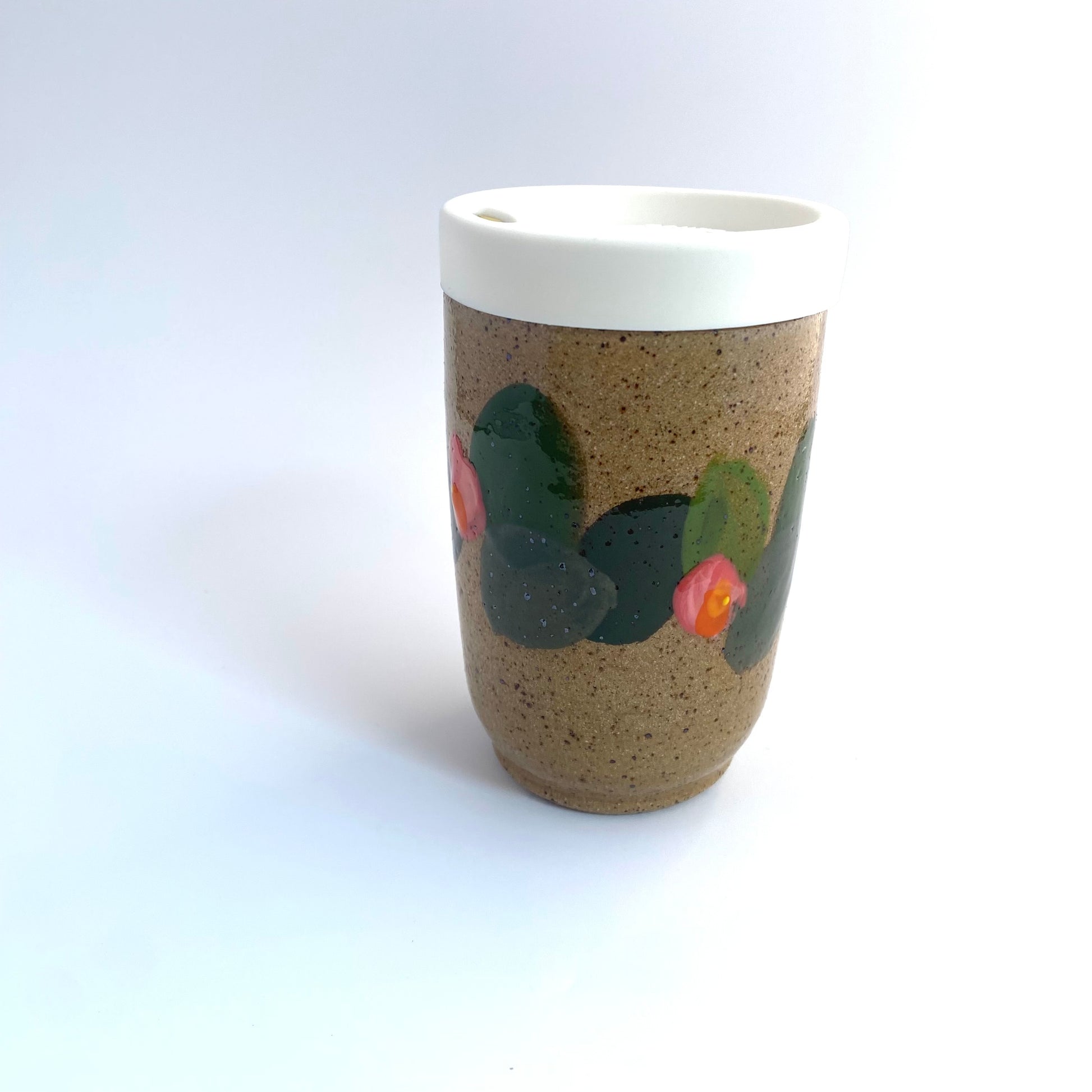 Wheel thrown travel tumbler in speckled earthenware. Hand painted in garden variety design and finished in clear gloss.