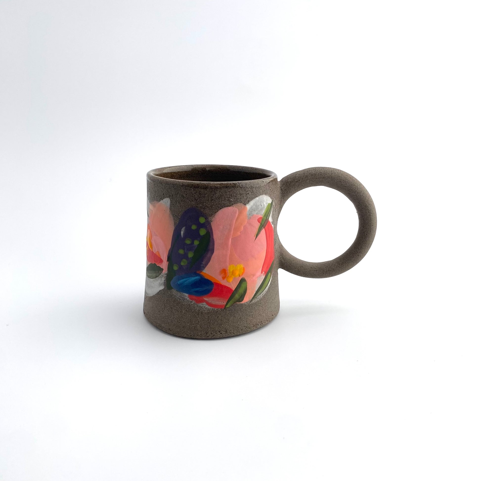 Wheel thrown mug in slate earthenware, painted in ‘gone bush’ design.