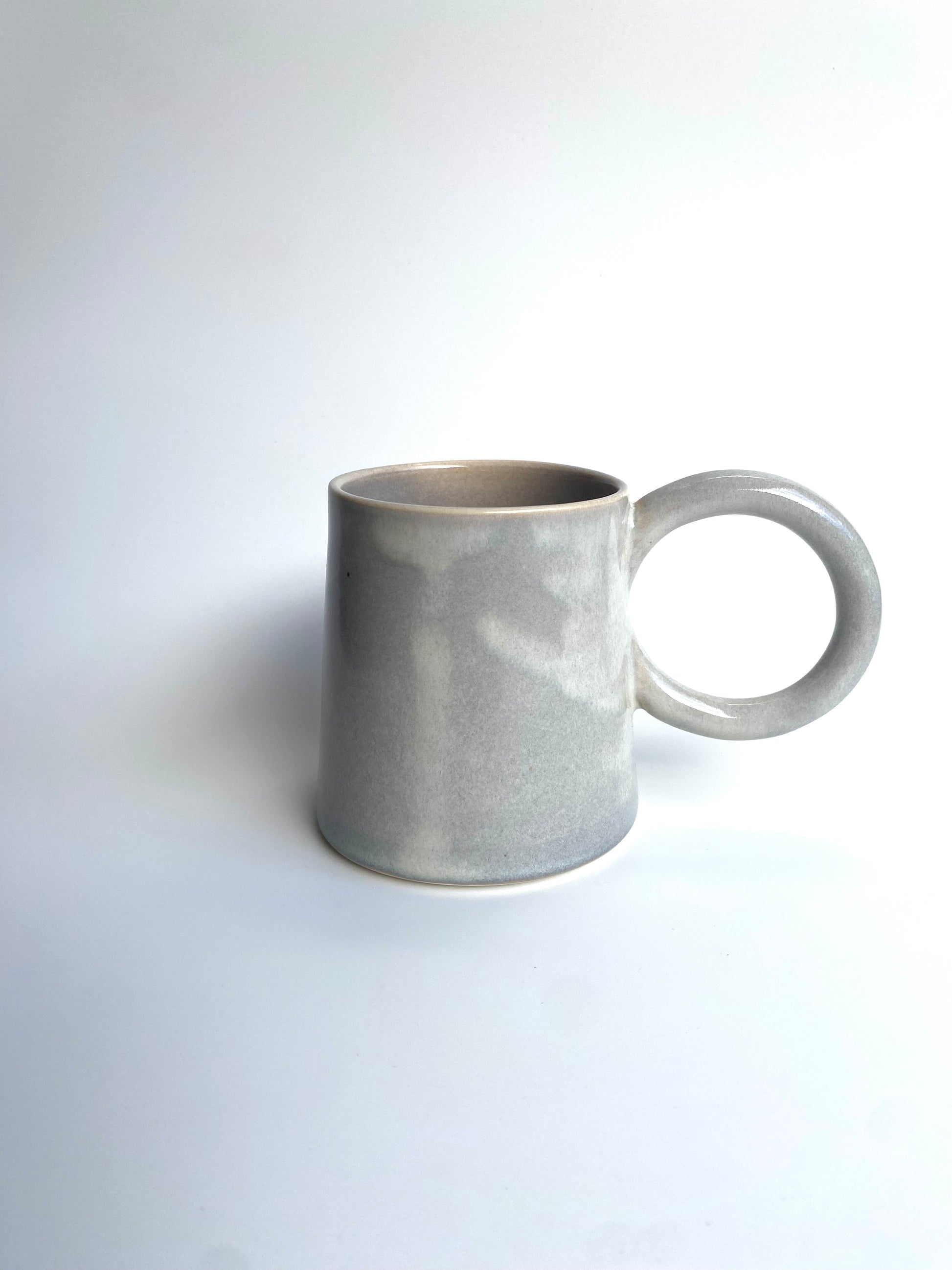 Wheel thrown mug in white earthenware, glazed in mist glaze.