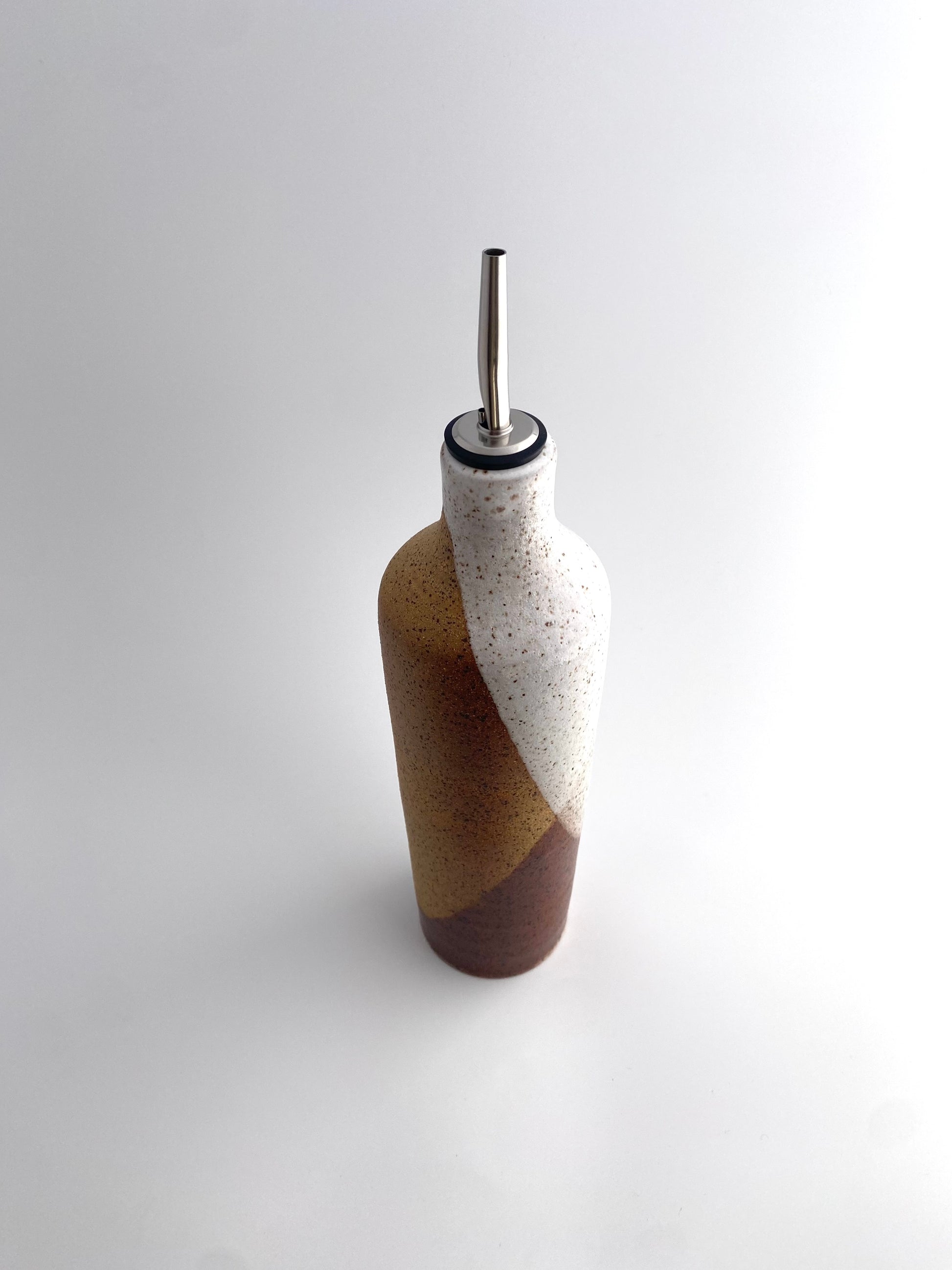 Wheel thrown olive oil vessel in speckled stoneware, glazed in desert landscape theme.